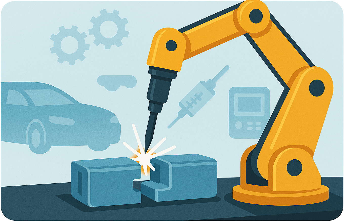 透過樹脂と吸収樹脂を組み合わせ、レーザー光で精密に加熱します。非接触・クリーンで、医療機器や美観を重視する筐体、電子デバイスに適しています。