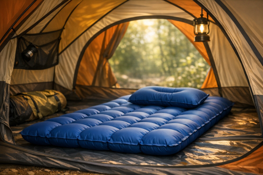 テントの大判シートのつなぎ目や、エアマット・エア枕の外周部には、気密性と耐久性が求められます。これらの部位では、高周波溶着(高周波ウェルダー)が使われることがあります。広い面積を均一に加熱できるため、仕上がりのばらつきが少なく、空気漏れを防ぎやすい点が特長です。