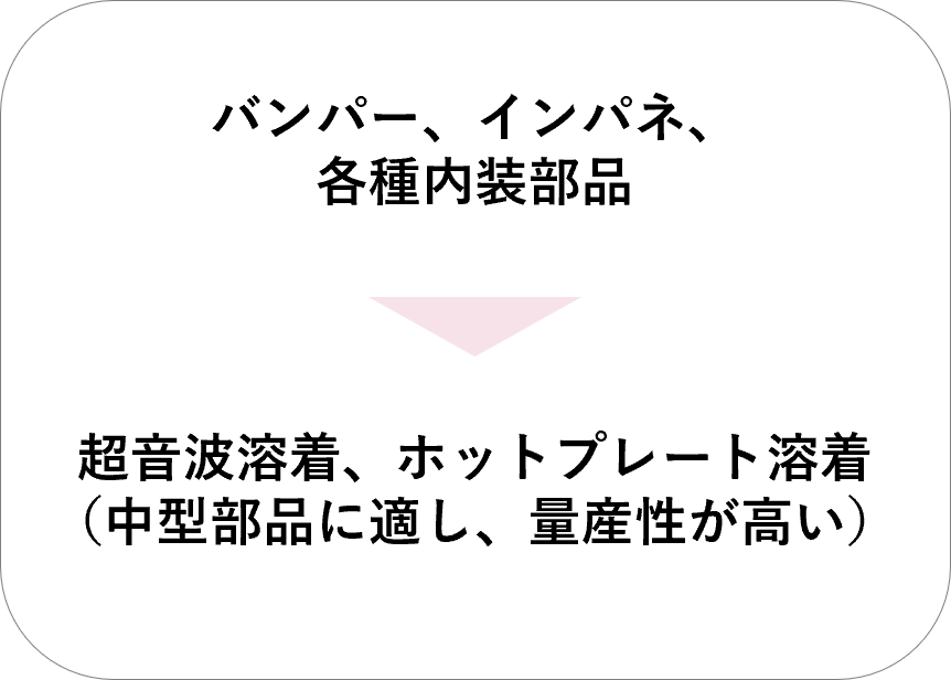自動車向け溶着では、部品の用途や要求性能に応じて工法が使い分けられています。強度、外観品質、気密性、生産性などの条件を踏まえ、最適な接合方法を選定します。