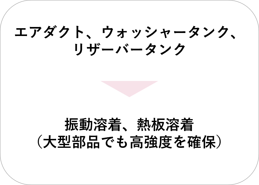 部品点数削減による軽量化や副資材削減、さらには単一素材化によるリサイクル性向上といった観点から、溶着は自動車部品の設計において重要な接合技術となりつつあります。しかし、すべての部品に同じ工法が適用できるわけではありません。材料特性や構造設計によって最適解は異なります。