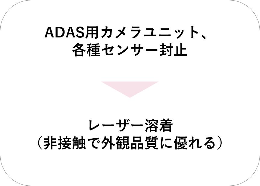 透過樹脂と吸収樹脂を組み合わせ、レーザで局所加熱。 非接触で外観品質に優れ、電子部品やカメラモジュールなど精密部品に適しています。EV関連部品でも採用が拡大しています。 それぞれの工法は万能ではありません。素材特性(PP、PA、PC、ABSなど)、充填材の有無、形状、要求強度、タクトによって最適解は変わります。ここを見誤ると、量産段階で不具合が顕在化します。そのため、溶着工法の選定は製造工程だけでなく、部品設計の段階から検討されることが重要です。